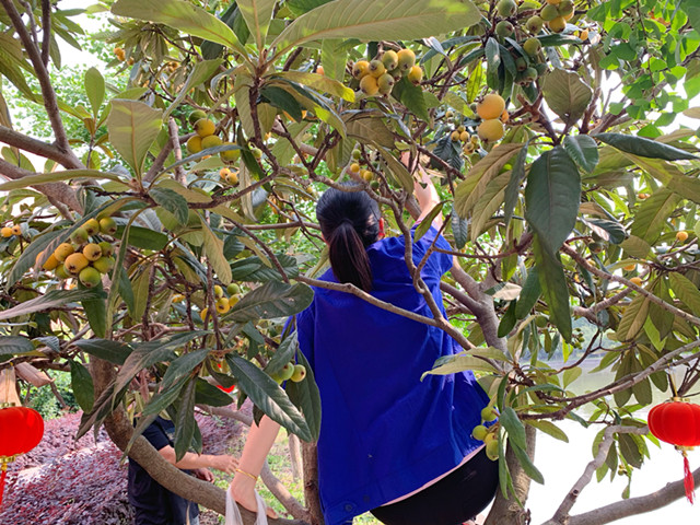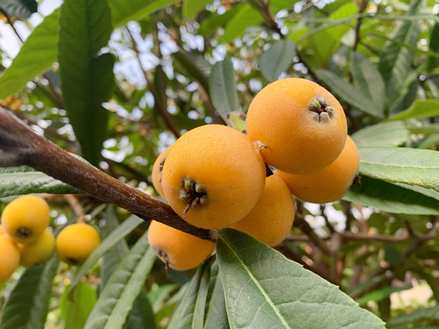 走近枇杷樹的一瞬間,空氣中甜甜的水果香味撲鼻而來,綠油油的枇杷樹葉迎著陽光盡情展開著,葉子之間下面鑲嵌著一顆顆成熟金黃的枇杷。